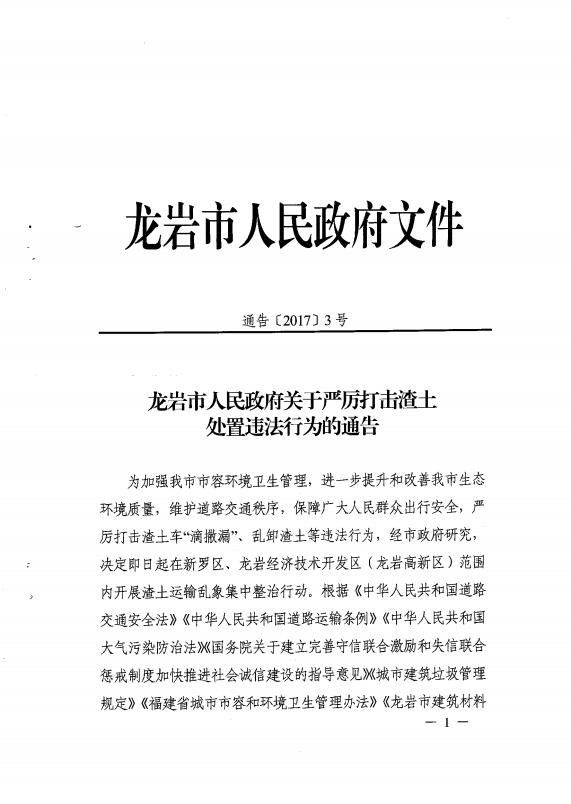 龍巖市人民政府關(guān)于嚴(yán)厲打擊渣土處置違法行為的通告(通告【2017】3號)