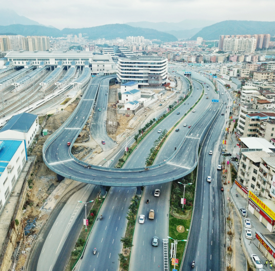 該項(xiàng)目屬于火車站北片區(qū)“一橫一縱一環(huán)”路網(wǎng)中的一環(huán),是火車站北站房片區(qū)的重點(diǎn)工程,也是連接羅龍路與火車站北站房旅客出發(fā)平臺的唯一通道,項(xiàng)目建成對完善片區(qū)功能開發(fā)需要具有重要意義。1月1日起,站前高架橋已順利通車,前往出發(fā)層的市民可從高架橋進(jìn)入北站房,而到站旅客將從廣場出站,進(jìn)出分流,交通疏導(dǎo)更加順暢。