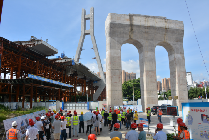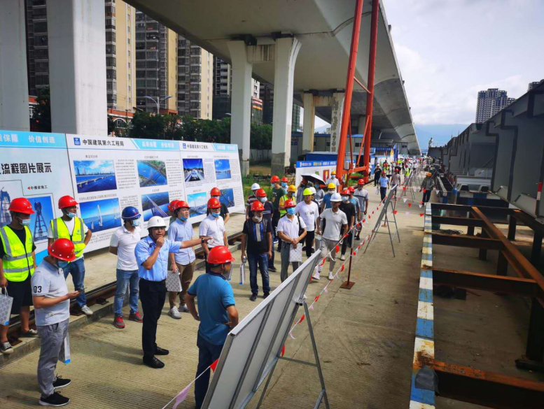 2020年6月28日,由龍巖城市發(fā)展集團有限公司主辦,龍巖市政建設(shè)集團有限公司(市城投公司)承辦,北京鐵研建設(shè)監(jiān)理有限公司、中國建筑第六工程局有限公司、中冶(上海)鋼結(jié)構(gòu)科技有限公司協(xié)辦的龍巖大道高架橋項目質(zhì)量安全標準化觀摩會在龍巖大道高架橋主橋鋼箱梁工程現(xiàn)場舉行。觀摩會分拼裝區(qū)域、提升站區(qū)域、頂推滑移區(qū)域、步履滑移區(qū)域及主橋轉(zhuǎn)體區(qū)域分別展示了龍巖大橋主橋鋼結(jié)構(gòu)拼裝、提升、弧形頂推滑移、步履滑移等新工藝及主塔“水平二次轉(zhuǎn)體”、鋼箱梁頂推、斜拉索施工技術(shù)。